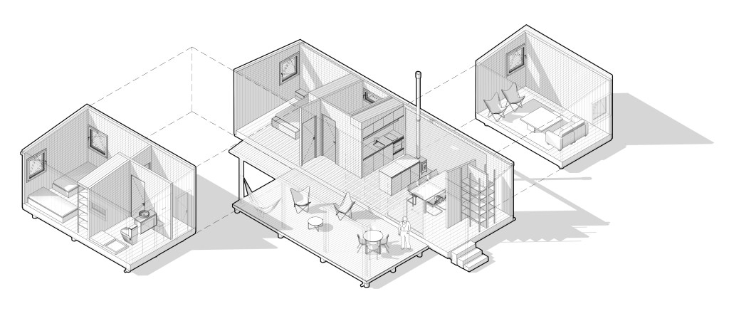 El sistema propuesto cuenta con 3 módulos iniciales posibles: Suite (30m2), Apart (45m2) y Casa (65m2), a los que se les puede agregar un “plug-in” de dormir y vivir para conformar una oferta de 8 modelos posibles. El Plug-in de dormir (REST) es para duplicar los espacios de cama de la vivienda y el Plug-in de vivir (LIVE) es para ampliar el área social de la casa.